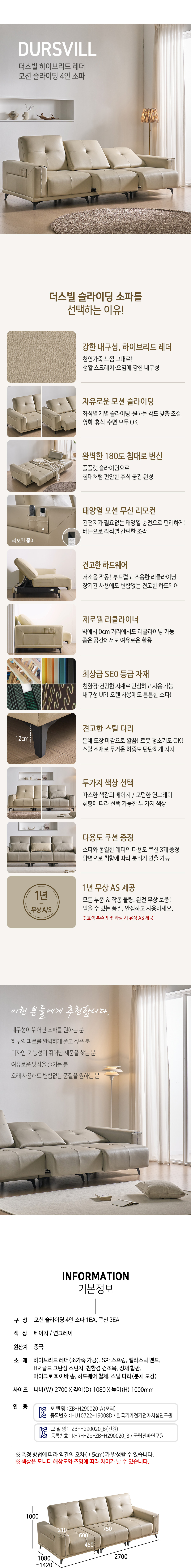더스빌 하이브리드 레더 모션 슬라이딩 무빙 침대 4인 리클라이너 소파