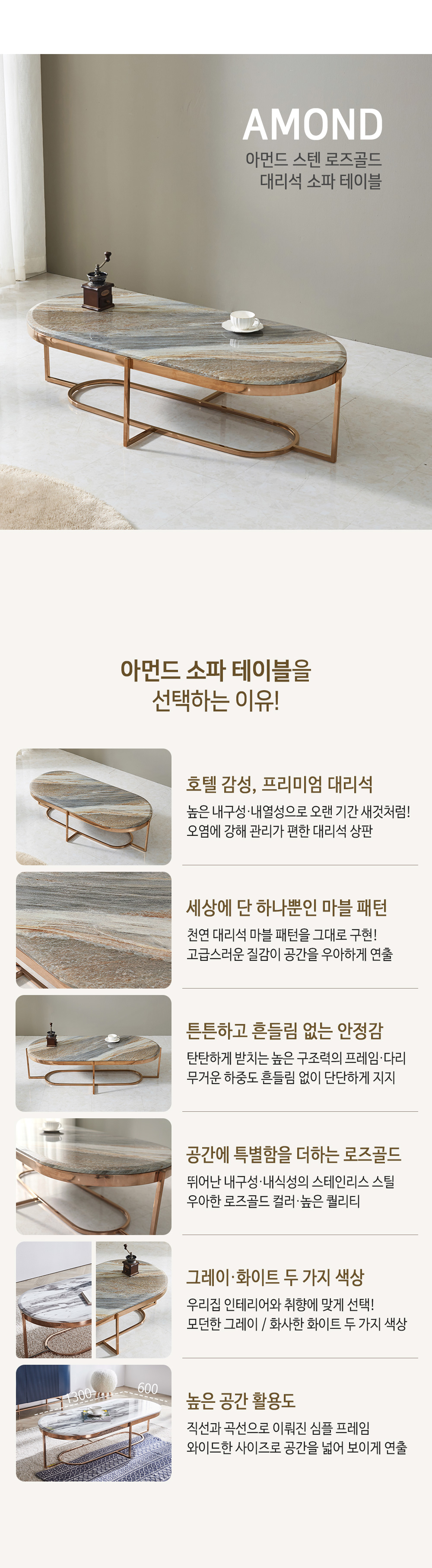 • 아먼드 스텐 로즈골드 대리석 거실 소파 테이블 좌탁